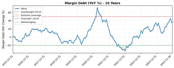 마진 부채 YoY 변동률이 36.31%로 높은 수준을 유지하며 시장 내 레버리지 축적과 투기 심리 확산을 나타냅니다. 50% 이상의 극단적 구간에는 미치지 않았으나, 과열 신호에 근접해 있어 향후 조정 위험이 존재합니다.