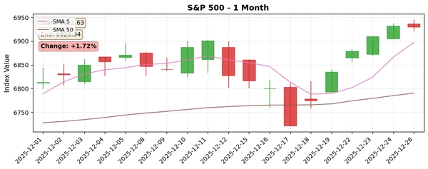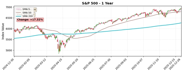 Nasdaq은 1년간 21.07% 상승하며 S&P 500보다 강한 상승세를 보이고 있습니다. 모든 이동평균선 위에 위치해 견고한 상승 추세를 유지 중이며, Disparity(200)은 13.74%로 약간의 과매수 신호가 있으나 극단적 수준은 아닙니다. RSI(14)는 50.35로 중립 상태입니다.