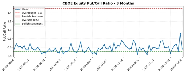 CBOE Equity Put/Call Ratio는 0.5~0.6 구간에서 움직이며 중립적에서 약간의 매도 심리를 반영합니다. 1개월 기간 하락은 단기 매도 심리 완화를 의미하나, 5일과 3개월 소폭 상승은 매도 포지션 증가를 시사합니다.