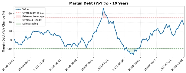 FINRA 마진 부채 연간 변동률은 1개월, 6개월, 1년 모두 상승세로 투자자들의 레버리지 확대와 위험 감수 성향 강화가 나타납니다. 다만 +50% 이상 과열 신호는 없으며, 변동성 큰 과거 패턴을 고려할 때 신중한 모니터링이 필요합니다.