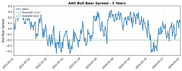 최근 3개월간 AAII Bull-Bear Spread가 -0.12에서 +0.12로 크게 상승하며 투자자 심리가 중립에서 약간 긍정적으로 전환되었습니다. 5일과 1개월 기간 동안 안정적인 긍정 심리를 유지하고 있으나, 극단적 매수 신호는 나타나지 않아 신중한 접근이 요구됩니다.