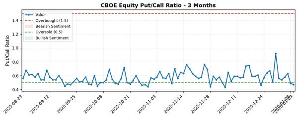 CBOE Equity Put/Call Ratio는 최근 5일과 1개월 동안 0.58에서 0.47로 하락하며 단기적으로 극단적 탐욕 신호에 근접했습니다. 3개월 기간은 중립 수준을 유지하고 있어 단기적 매도 신호 약화와 중기적 신중함이 공존합니다.